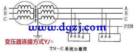 一般在低壓配電線路中都采用的是四根導線進行傳輸?shù)?。在高?0KV降到低壓380V的過程中所用的變壓器,它的一次繞組的連接形式是三角形的連接方式,變壓器的二次繞組所采用的連接方式是星形連接方式,如下面的示意圖所示。這樣以來從變壓器中性點引出的導線我們叫它工作零線,從變壓器次級繞組上引出的線叫火線。
