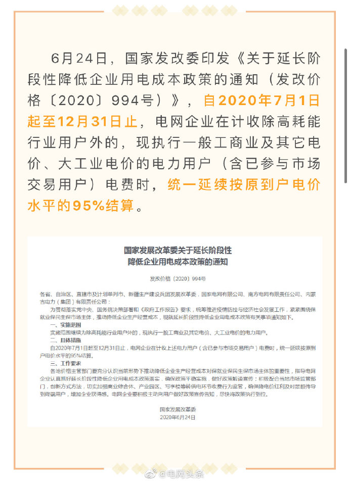 除高耗能行業(yè)用戶,現(xiàn)執(zhí)行一般工商業(yè)及其它電價、大工業(yè)電價的電力用戶,請注意:下半年,電費繼續(xù)打95折,國家電網(wǎng)把紅包給您續(xù)上了!