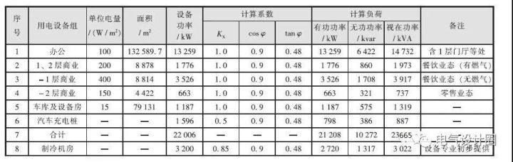 在方案設(shè)計(jì)(初設(shè))階段,按負(fù)荷密度指標(biāo)法進(jìn)行負(fù)荷計(jì)算,過程并不復(fù)雜,需注意的是,本項(xiàng)目設(shè)置了電動(dòng)汽車充電樁,而常規(guī)的汽車庫用電指標(biāo)8 ~ 15 W / m2并沒有包含充電樁負(fù)荷。北京市對辦公建筑的電動(dòng)汽車充電樁配置要求為總停車位數(shù)量的25 %,慢充、快充的配建比例為5 ∶ 1 ~ 10 ∶ 1之間,本項(xiàng)目取9 ∶ 1。一般情況下,快充充電樁用電指標(biāo)為30 kW / 臺,慢充充電樁用電指標(biāo)為7 kW / 臺,用電負(fù)荷折算到變壓器時(shí),需要系數(shù)取0. 3 ~ 0. 7,本工程取0. 5,總停車位數(shù)量 1 373個(gè),于是可計(jì)算充電樁總裝機(jī)負(fù)荷為:1 373 × 25 % ×(0. 9 × 7 + 0. 1 × 30)= 1 596 kW。表1為方案設(shè)計(jì)階段的負(fù)荷計(jì)算表。