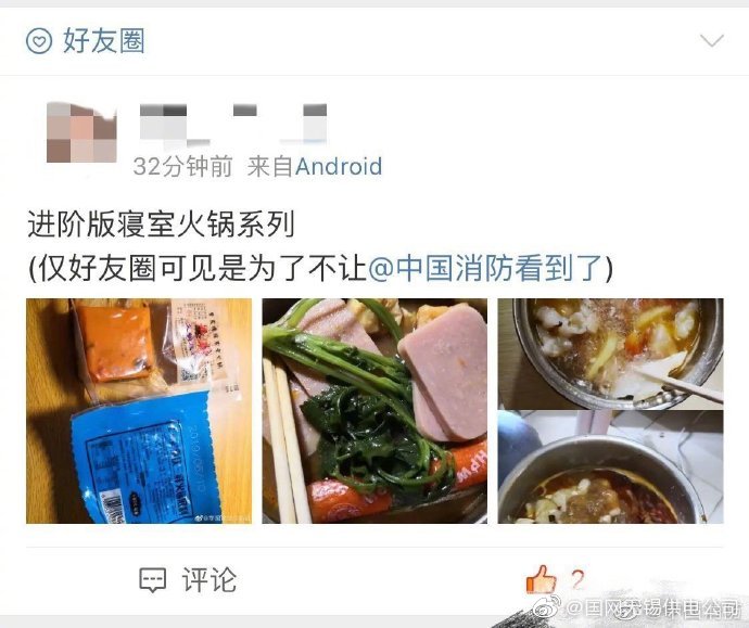 【在宿舍吃火鍋,想曬圖又怕被發(fā)現(xiàn),于是……】宿舍火鍋愛好者,為吃頓火鍋,也是煞費(fèi)苦心!準(zhǔn)備齊全后拍個照,發(fā)微博前先設(shè)個“僅好友圈可見”。喲喲喲,不被發(fā)現(xiàn)就是“安全”了?你的“圖一時之快”,可能換來的是一個宿舍,甚至一棟宿舍樓的“不安全”!引來電火得不償失。