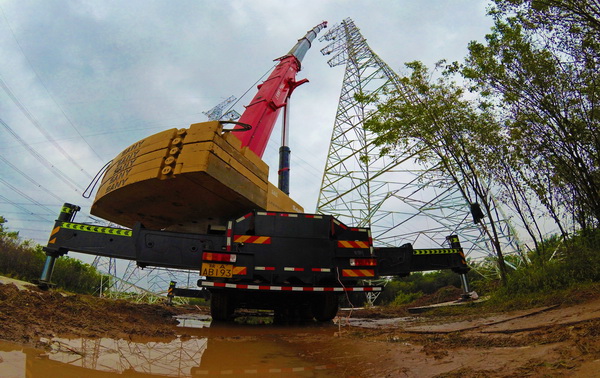 A42號(hào)鐵塔高85米,重116噸,停電后才能組立。為提高功效,項(xiàng)目部調(diào)用200噸吊車(chē)組立。現(xiàn)場(chǎng)泥濘濕陷,吊車(chē)進(jìn)不去,項(xiàng)目部又用水泵抽水,用60多塊鋼板鋪路,給吊車(chē)創(chuàng)造條件。
