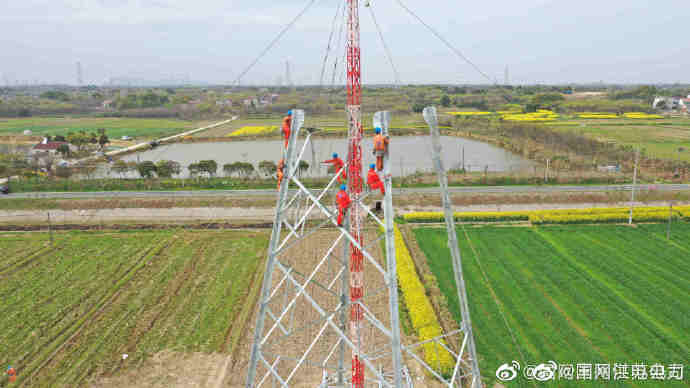 4月18日,在常州金壇區(qū)薛埠鎮(zhèn)洮湖-方麓110千伏線路施工現(xiàn)場(chǎng),國(guó)網(wǎng)常州供電公司員工正在組裝20#塔。本工程采用架空電纜混合形式,新建桿塔68基,線路路徑長(zhǎng)16.901公里。220千伏方麓變電所負(fù)荷趨于飽滿,該線路可由220千伏洮湖變分擔(dān)其部分負(fù)荷,在迎峰度夏用電高峰期可靈活切換,優(yōu)化電網(wǎng)。