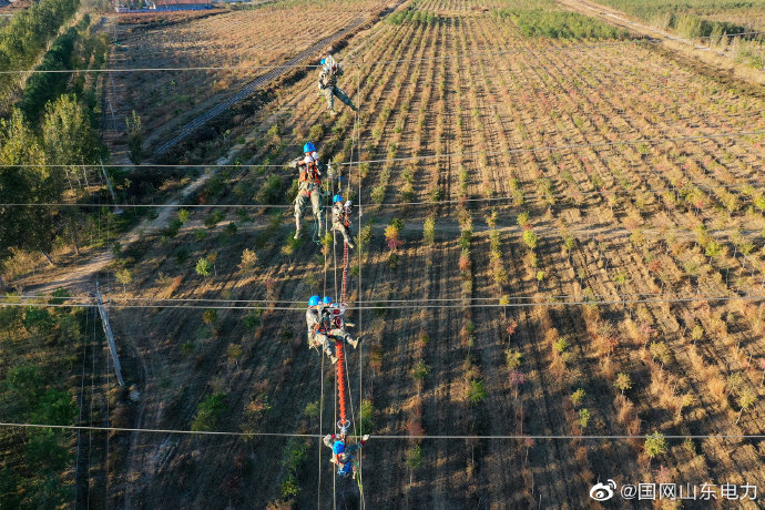 【走在藍(lán)天上的空中舞者】11月10日,國網(wǎng)墾利區(qū)供電公司工作人員在110千伏坨東線30號(hào)和31號(hào)鐵塔輸電線路上安裝相間間隔棒。共在110千伏坨東線和雙勝線上安裝間隔棒44支,防止冬季寒潮大風(fēng)天氣線路舞動(dòng)導(dǎo)致跳閘,空中舞者守護(hù)線路安全。 ????