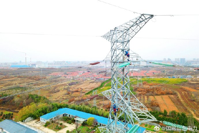 【消除線路隱患 保障供電安全】11月25日,在威海市豐山,國網(wǎng)威海供電公司?輸電運檢人員對跨越山林的220千伏威昆線進行檢修,修復(fù)破損的絕緣子,為處于山谷風(fēng)口處的導(dǎo)線加裝防舞動間隔棒,進一步提升線路運行穩(wěn)定性,確保安全、可靠供電。 ????