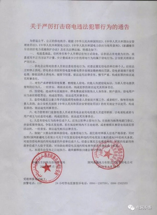 為營造公平、公正的供電秩序,根據(jù)《中華人民共和國刑法》、《中華人民共和國治安管理處罰法》、《中華人民共和國電力法》、《中華人民共和國電力供應與使用條例》、《新疆維吾爾自治區(qū)電力設施保護辦法》及有關法律法規(guī),特通告如下: