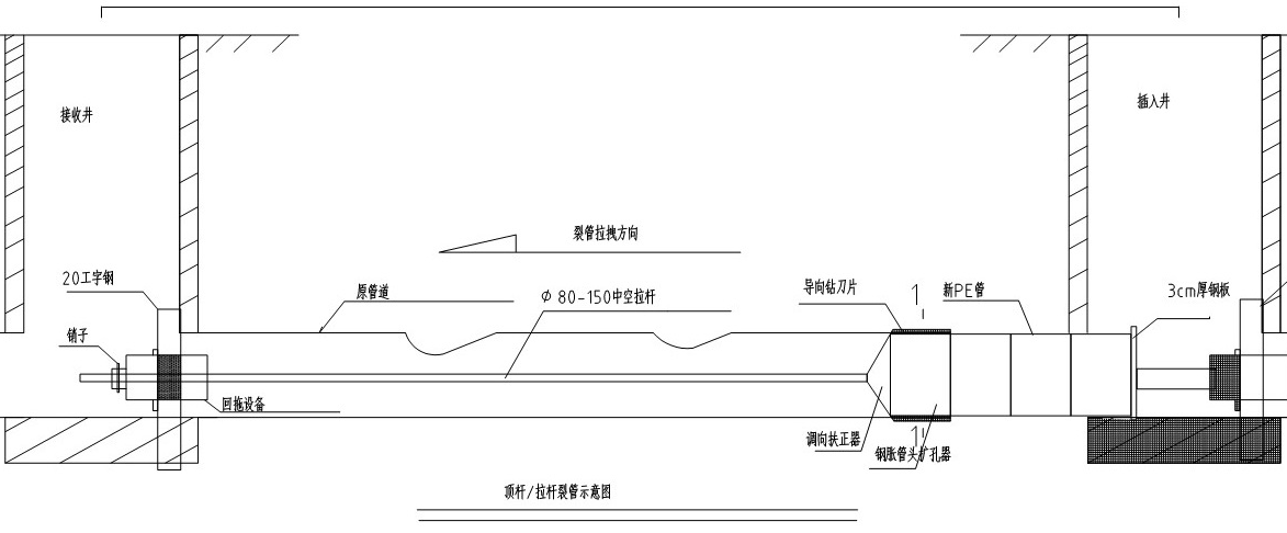 在導(dǎo)向拉桿回拖過程中,調(diào)向扶正器、導(dǎo)向鉆刀片、鋼脹管頭擴(kuò)孔器處于管道前端,起到劃開舊管道,“開路”,的作用,在擴(kuò)孔器的尾端連接戶PE管道,擴(kuò)孔器的直徑要比舊管道的內(nèi)徑略大一些,并且要比新管道的外徑要稍微大些,以便減少新管道進(jìn)入的摩擦力,并且為頂進(jìn)新管道留下一定的余地。同時(shí),在擴(kuò)孔器的尾端緊挨著新管道節(jié)段,新管道節(jié)段緊隨擠擴(kuò)頭回拖。在導(dǎo)向拉桿的拖拉作用下擴(kuò)孔器、新管道依次從插入并進(jìn)入空腔并逐步向前推進(jìn),最終將整條管道更換。