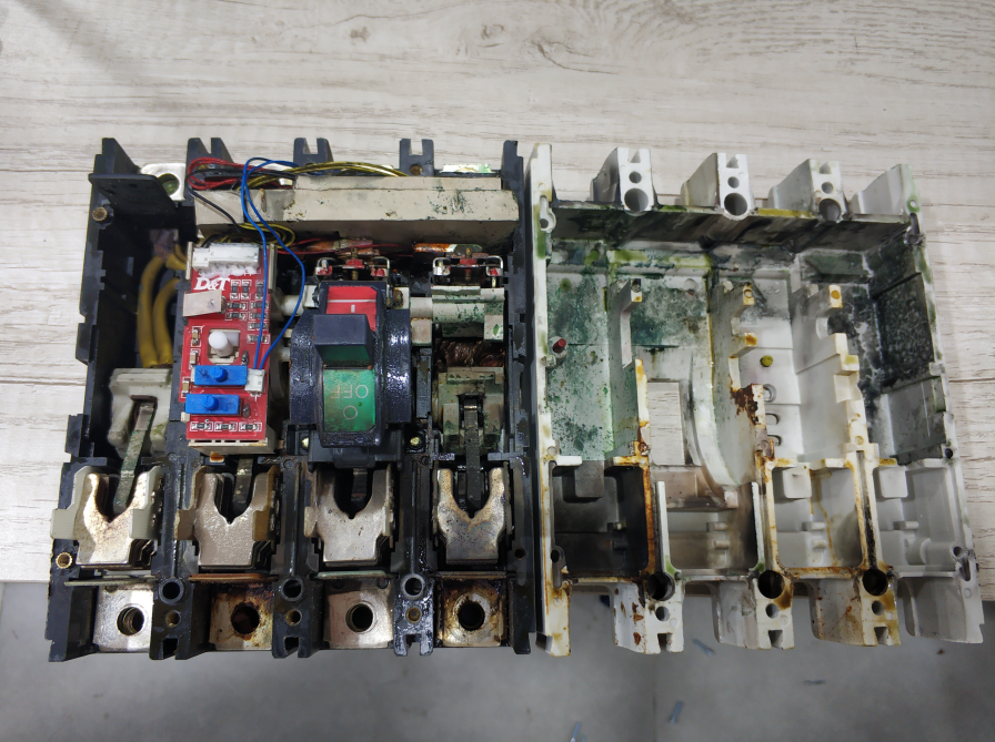 因開(kāi)發(fā)商未及時(shí)處理地面水漬,高溫天氣產(chǎn)生水蒸氣,水蒸氣至樓層頂部時(shí)產(chǎn)生凝露,水滴落至開(kāi)關(guān)內(nèi)部造成相對(duì)地,和相間短路造成開(kāi)關(guān)損壞。再次,頻繁跳閘原因是,因水漬進(jìn)入開(kāi)關(guān)內(nèi)部,開(kāi)關(guān)保護(hù)回路電路板損壞,導(dǎo)致漏電保護(hù)功能動(dòng)作,頻繁跳閘。