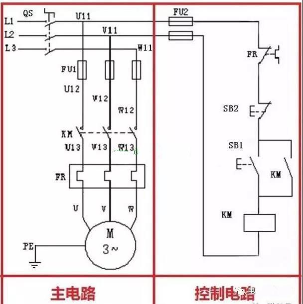 如上圖所示:QS代表電源開關(guān),F(xiàn)U代表保險絲(熔斷器),F(xiàn)R代表熱保護,SB代表按鈕開關(guān),KM代表接觸器,M代表電動機。