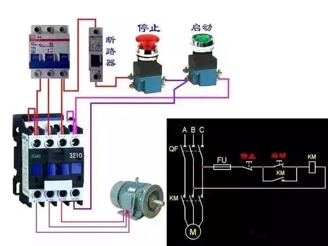 明白了實(shí)物接線以后我們再看電路圖就很容易理解了,右方是接觸器自鎖電路圖,ABC分別電表三相火線電源,QF開關(guān),KM是接觸器,F(xiàn)U是熔斷器,KM帶個(gè)方口就是接觸器線圈電源,按鈕的位置,連在一起的是要接常閉,分開的是要接常開,圓圈M 是負(fù)載電動機(jī),根據(jù)實(shí)物接線圖再結(jié)合自鎖電路圖!