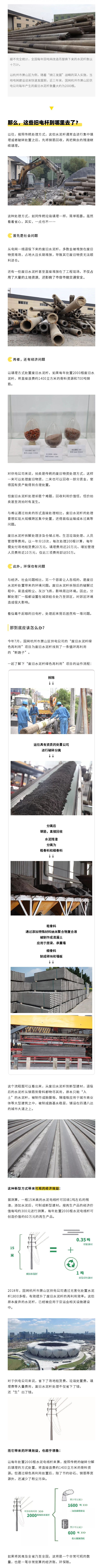02【廢舊水泥桿去哪里了?】據(jù)不完全統(tǒng)計,全國每年因電網(wǎng)改造而替換下來的水泥桿數(shù)以十萬計。以杭州市蕭山區(qū)為例,隨著“擁江發(fā)展”戰(zhàn)略的深入實施,當?shù)仉娋W(wǎng)建設迎來快速發(fā)展期,近三年來,國網(wǎng)杭州市蕭山區(qū)供電公司每年產(chǎn)生的廢舊水泥桿數(shù)量大約為2000根。那么,這些舊電桿到哪里去了?
