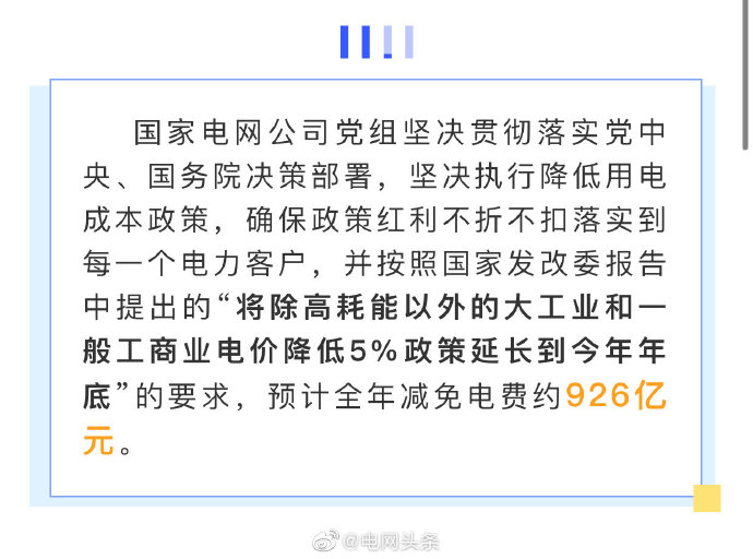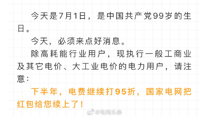 除高耗能行業(yè)用戶,現(xiàn)執(zhí)行一般工商業(yè)及其它電價、大工業(yè)電價的電力用戶,請注意:下半年,電費繼續(xù)打95折,國家電網(wǎng)把紅包給您續(xù)上了!