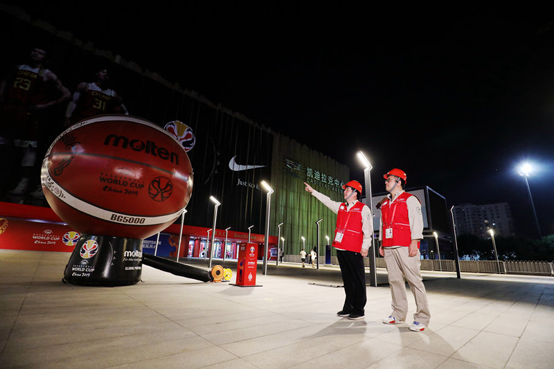 9月2日,北京海淀供電公司湯鴻博和王瑋在五棵松籃球館,進行2019男籃世界杯賽場用電設(shè)施保障工作,對賽場內(nèi)外用電設(shè)施進行巡視。(王洋)