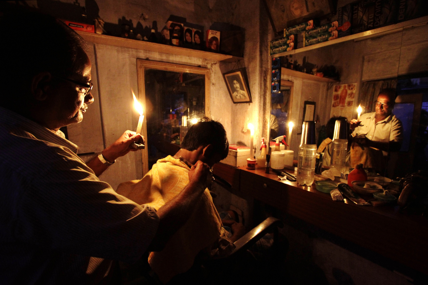 An Indian barber holding a candle, has a haircut for a customer at his shop in Kolkata, India, Tuesday, July 31, 2012. India’s energy crisis cascaded over half the country Tuesday when three of its regional grids collapsed, leaving 620 million people without government-supplied electricity for several hours in, by far, the world’s biggest blackout. (AP Photo/Bikas Das)