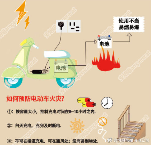 【預防電動車火災 正確充電是關(guān)鍵】近年來,全國各地頻繁發(fā)生電動車起火事故,造成財產(chǎn)損失和人員傷亡。如何預防電動車火災,按照電瓶容量大小的不同,一般在8-10小時內(nèi)就能充滿;盡量在白天充電,充電后一定要及時斷電;別在樓道內(nèi)充電,充電時請通風,最佳環(huán)境溫度是25℃。