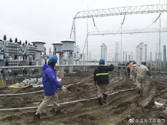 1月10日,常州地區(qū)依舊陰雨連綿,江蘇省送變電有限公司的施工人員依舊在500千伏中吳變的施工現(xiàn)場冒雨戰(zhàn)斗。中吳變的主變構(gòu)架至220千伏構(gòu)架的高跨線有70余米,為將6根高跨線從壓接區(qū)搬運(yùn)至安裝位置大家齊心協(xié)力、步調(diào)一致共同完成這項工作,為下一步軟母線安裝做好準(zhǔn)備。雖然寒風(fēng)夾雜著雨水,顯得更加寒冷,大家的熱情卻絲毫不減,用實際行動保證工程的按期投運(yùn)。