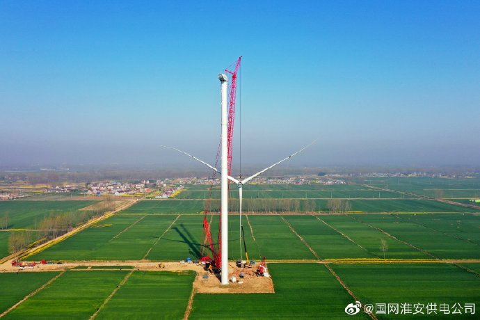 【加快風電項目配套建設】4月7日,施工人員在漣水縣六塘河公興河風電場安裝風力發(fā)電機組。連日來,淮安漣水縣供電公司組織人員積極對接六塘河公興河風電場項目,全力做好項目配套線路和變電站間隔建設,保證風電項目按期投產(chǎn)發(fā)電,有效改善當?shù)啬茉唇Y(jié)構(gòu)