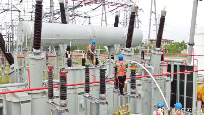 【電網(wǎng)增容擴建助力地方經(jīng)濟發(fā)展】4月17日,在江蘇南通三官殿500千伏變電站主變增容工程現(xiàn)場,江蘇省送變電有限公司施工人員正在安裝主變設備。本次擴建將原有2臺750兆伏安主變增容為1000兆伏安,預計6月份投入運行。運行后將有效緩解現(xiàn)有主變供電壓力,滿足南通東南片區(qū)經(jīng)濟發(fā)展,大幅提升500千伏電網(wǎng)供電可靠性。