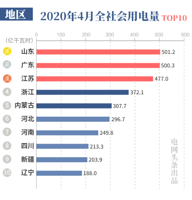 2020年4月份,山東、廣東和江蘇的全社會(huì)用電量位列全國前三甲,分別為501.2 億千瓦時(shí)、500.3億千瓦時(shí)和477.0 億千瓦時(shí)。