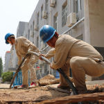 6月25日,中國農(nóng)歷傳統(tǒng)端午節(jié),在安徽省渦陽縣第二中學高考考點,電力施工人員冒著高溫,加班加點,為考場空調(diào)用電敷設(shè)專用電力線路。