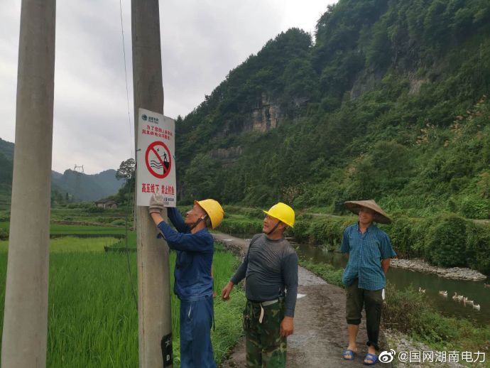 7月19日,國(guó)網(wǎng)鳳凰縣供電公司員工楊長(zhǎng)青等人在竿子坪鎮(zhèn)洞腳村魚塘附近安裝“高壓危險(xiǎn),禁止釣魚”標(biāo)示牌。(滕新春) ????