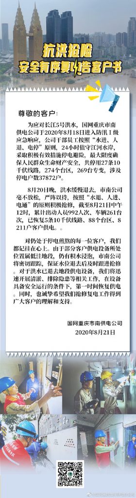 重慶市南供電公司《抗洪搶險(xiǎn) 安全有序復(fù)電告客戶書》