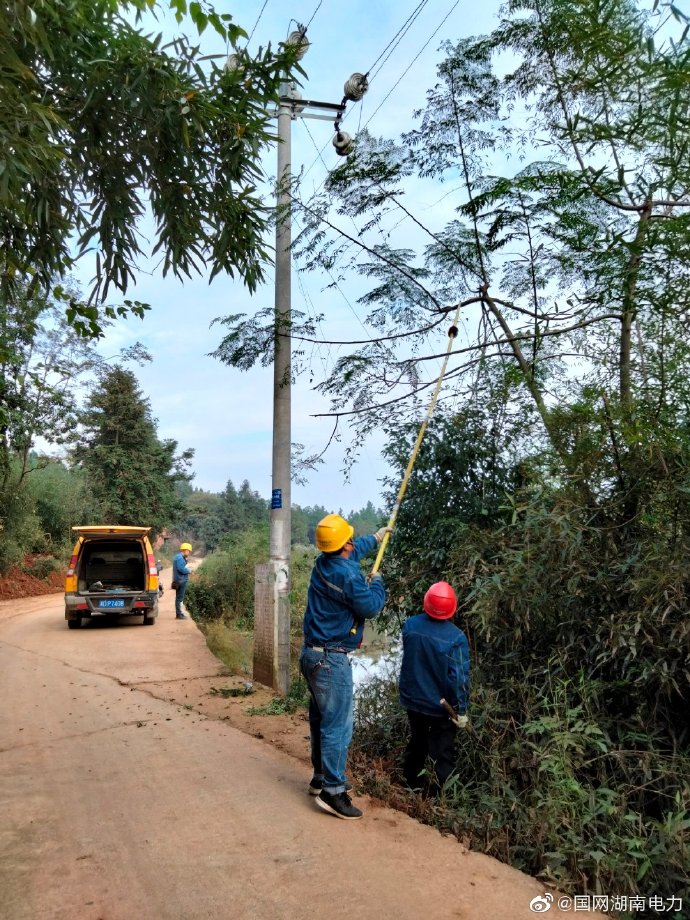 11月4日,國網(wǎng)衡山縣供電公司白果供電所配電班的電力蜀黍們對10千伏貫沖線進行巡視工作,同步對發(fā)現(xiàn)的樹竹對線距離過近隱患進行砍青除障工作,確保線路安全穩(wěn)定運行。(周玉美)