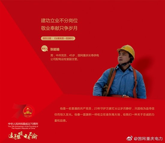 張能瑜,中共黨員,全國勞模,國網(wǎng)長壽供電公司配電運檢室副主管。1996年他從一個對電好奇的青年變成了一名護電的線路檢修工人,每天的工作就是和水泥桿、鐵塔、導(dǎo)線打交道。在任武隆巡線站站長時,為了盡快摸清路線,掌握第一手資料,他徒步從涪陵至武隆、彭水一帶沿線進發(fā),有溝跨溝,無路開山,把自己一個人當(dāng)成了一支隊伍。45天之后,磨破三雙膠鞋,終于走完290公里,巡視完587座鐵塔,成為公司第一個,也是唯一一個掌握了渝東南220千伏線路走向的人。這股認真的精神貫穿了他的職業(yè)生涯,從業(yè)23年來他先后獲得了全國勞動模范、全國五一勞動獎?wù)?、國家電網(wǎng)公司勞動模范、感動重慶十大人物,國家電網(wǎng)十大杰出青年等等近百項榮譽,公司成立了以他名字命名的勞模創(chuàng)新工作室,還組建了安全隱患排查隊,他成為帶頭人。盡管工作環(huán)境和性質(zhì)都發(fā)生了改變,但十多年的巡線留給他的習(xí)慣依然未變,周末或節(jié)假日,他依然像巡線一樣,走鐵塔,看線路,一走就是兩萬多步。大家經(jīng)常開玩笑說:“張勞模,你是在刷步數(shù)嗎?又占據(jù)了朋友圈的封面!”其實,他不是想要占據(jù)朋友圈封面,他就是想以黨員的身份舉起一面旗幟,帶領(lǐng)大家奔向更光亮的生活!