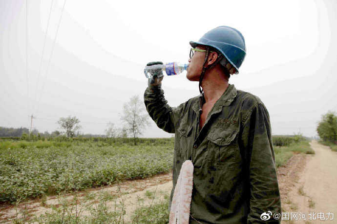 七月流火,正是一年之中最熱的季節(jié)。滾滾熱浪令人窒息,很多人對出門都望而卻步。然而,有這樣一群人,他們戰(zhàn)高溫、斗酷暑,頑強地奮戰(zhàn)在電網(wǎng)迎峰度夏第一線。7月28日,10千伏武專523線路武官寨公變3設(shè)備線夾燒斷,國網(wǎng)故城縣供電公司立即組織人員進行搶修,搶修人員冒著高溫攀爬在接近40度的電線桿上,一絲不茍地開展搶修作業(yè),任憑滿臉的汗水順著脖子流淌,濕透了衣襟,他們?nèi)活櫜簧喜潦靡幌?。圖為故障全部排除、線路恢復(fù)供電后,從桿上下來的搶修人員正在補充水分。