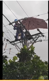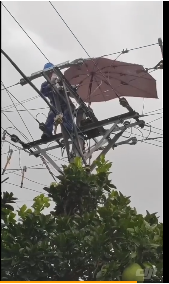 8月12日,國(guó)網(wǎng)廣安供電公司華鎣供電分公司中和供電所員工們?cè)?0KV中臨線羊頭壩村5號(hào)臺(tái)區(qū)2號(hào)桿“電桿上撐傘改負(fù)荷”,確??蛻舴€(wěn)定可靠用電無(wú)憂。
