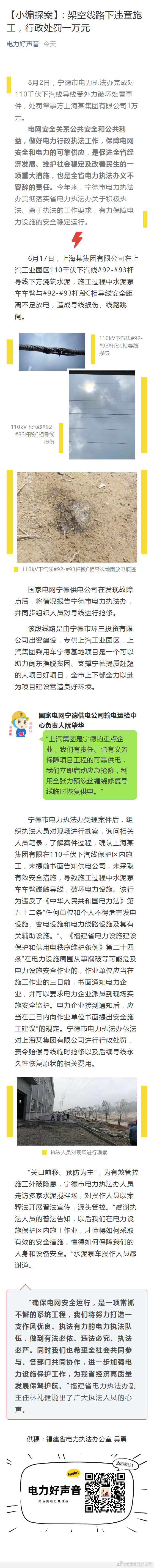 【架空線路下違章施工,行政處罰一萬元】電網(wǎng)安全關(guān)系公共安全和公共利益,做好電力行政執(zhí)法工作,保障電網(wǎng)安全和電力的可靠供應(yīng),是促進(jìn)全省經(jīng)濟(jì)發(fā)展、維護(hù)社會穩(wěn)定及改善民生的一項重大措施,也是全省電力執(zhí)法辦義不容辭的責(zé)任。今年來,寧德市電力執(zhí)法辦貫徹落實省電力執(zhí)法辦關(guān)于積極執(zhí)法、勇于執(zhí)法的工作要求,有力保障電力設(shè)施的安全穩(wěn)定運行。