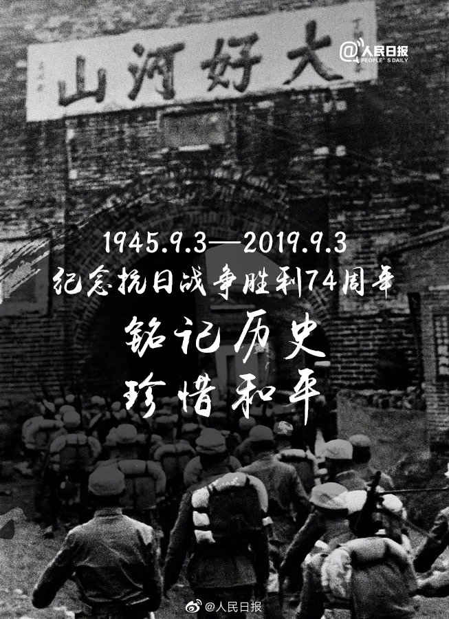 【今天發(fā)條微博,為了不能忘卻的紀念】9月3日,是每個中國人都該銘記的日子。14年浴血奮戰(zhàn),3500多萬同胞傷亡,74年前的這一天,終于迎來中華民族的勝利。如今,硝煙散去,可那段血淚寫就的過去不能忘,那場不屈不撓的抗爭不敢忘。今天,中國人民抗日戰(zhàn)爭勝利紀念日,勿忘歷史,吾輩自強!