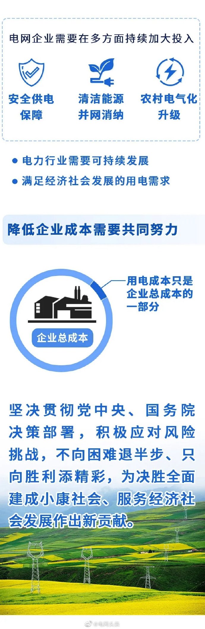 國(guó)家電網(wǎng)有限公司在以習(xí)近平同志為核心的黨中央堅(jiān)強(qiáng)領(lǐng)導(dǎo)下,認(rèn)真貫徹落實(shí)黨中央、國(guó)務(wù)院各項(xiàng)決策部署,堅(jiān)持穩(wěn)中求進(jìn)工作總基調(diào),堅(jiān)持新發(fā)展理念,堅(jiān)持高質(zhì)量發(fā)展,落實(shí)“六穩(wěn)”工作要求,穩(wěn)投資、保民生,全力完成2019年建設(shè)任務(wù),科學(xué)安排2020年電網(wǎng)投資。